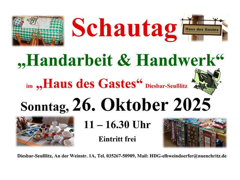 Home Events Schautag “Handarbeit und Handwerk” im Haus des Gastes Diesbar-Seußlitz Schautag “Handarbeit und Handwerk” im Haus des Gastes Diesbar-Seußlitz + Zu Google Kalender hinzufügen + iCal / Outlook export 00 Tage 00 Stunden 00 Minuten 00 Sekunden Datum 26 Okt. 2025 Uhrzeit 11:00 - 16:30 Veranstaltungsort Haus des Gastes Diesbar-Seußlitz An der Weinstraße 1A, 01612 diesbar-Seußlitz